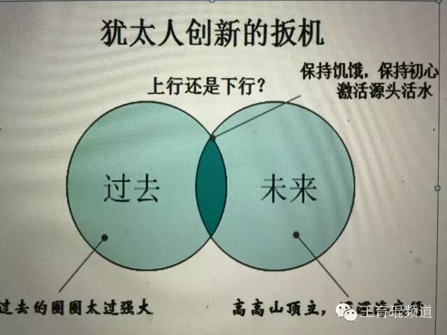 探寻犹太人的创新密码,是我考察以色列的重点。我向希伯来大学81岁的奥曼教授请教,他用两个圆的交汇来说明犹太人的创新。每一个当下的人生,都是两个圆的交汇,一个是过去的圆,一个是未来的圆。对大多数人来说,因为过去的圆成就了你——里面有太多的经验、习惯、知识、技术、矛盾、纠结、理论、理念、教条、利益、身份、名望等等——它会形成强大的习性,一直拽着你沿着旧有的轨道下坠。而每个以色列人心目中,同时还有一个未来的圆,那是他们最初关于未来的梦想,是未来的一幅大画面。如果时时处处想着这个未来的大画面,分分钟与未来建立连接关系,分分钟从未来思考当下的做法,那就注定会有创新冒出来。