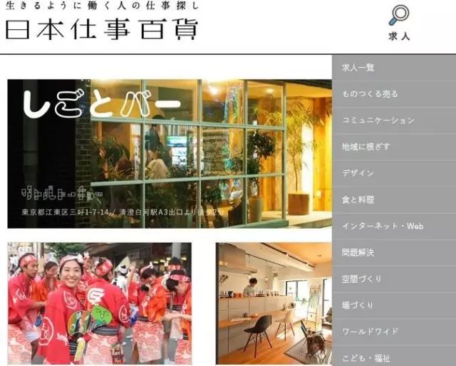 仕事百货将工种分类成:地方扎根、农业渔业林业、物品制作贩卖、design、worldwide、日本の伝统、让世界变得更好、空间营造、旅馆与民宿、good idea,虽然分类笼统,但会吸引人点进去看个究竟。