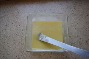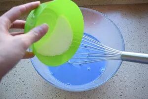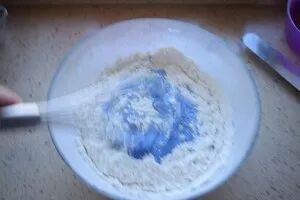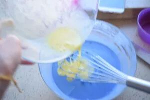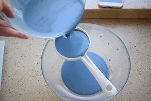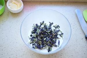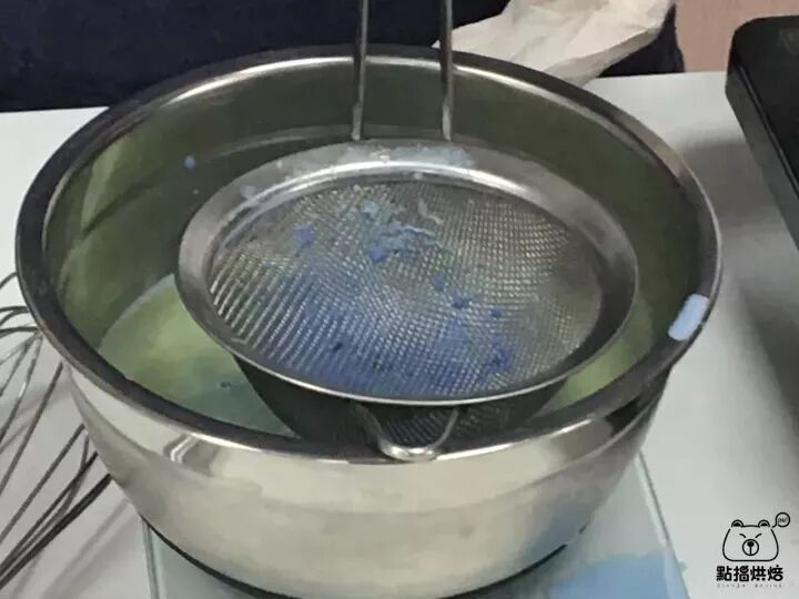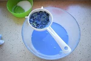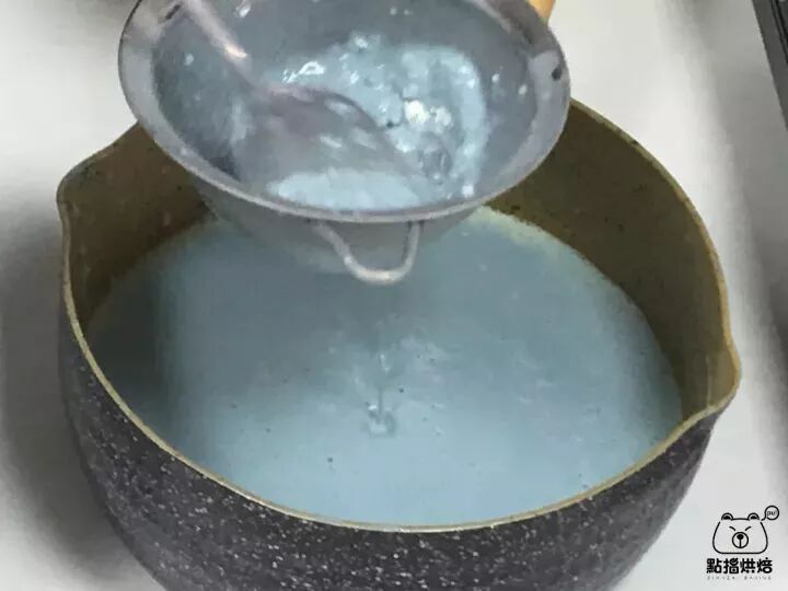 3.过滤出蝶豆花。再次搅拌均匀(不然是绿色的哦),让黄油充分混合。