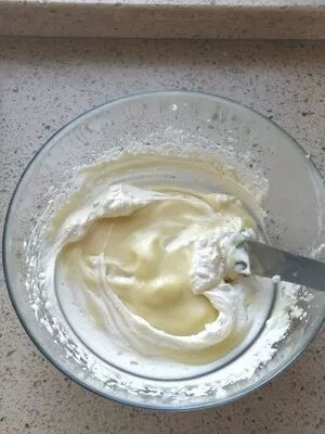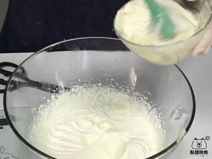 6.芝士和糖用电动打蛋器打发,加入一滴香草精和君度酒,混合均匀。