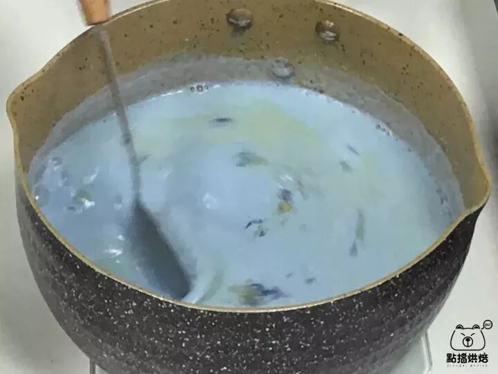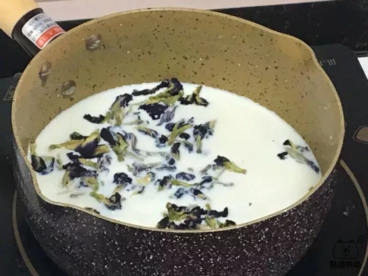 1.在牛奶中放入蝶豆花,用小奶锅加热。