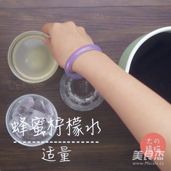 先将柠檬汁挤出,加入蜂蜜调成蜂蜜柠檬水,将其倒入杯子,将冰块加满到杯口