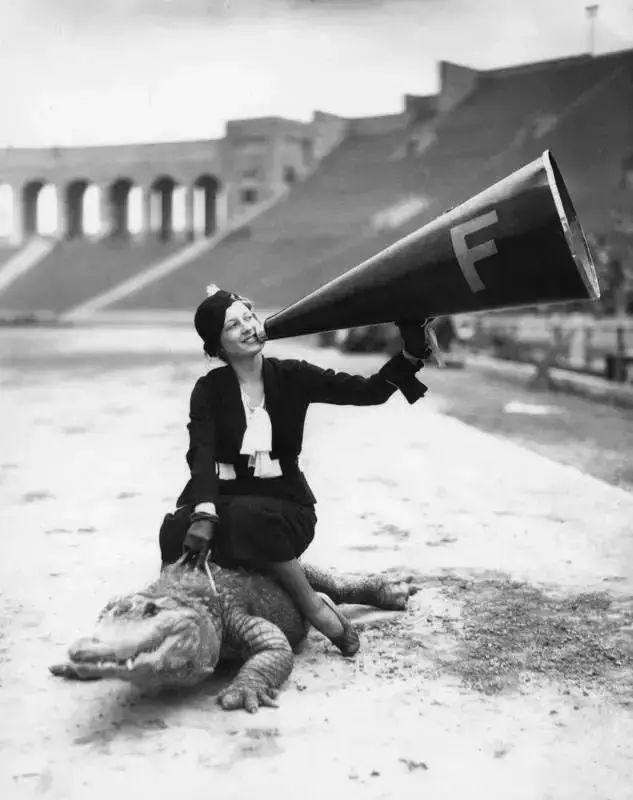 1934,一名女学生骑着佛罗里达大学的吉祥物:鳄鱼,参加美式足球比赛开幕仪式