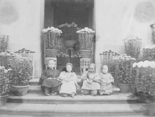 1892年,福州,四名儿童在一个庭院里合影,身边是一盆盆盛开的菊花。