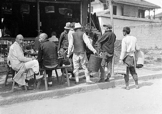 杭州一家鸟店, 客人们品茶看鸟。西德尼·甘博摄于1917-1919年间。