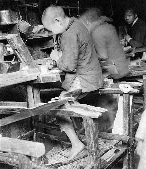 木作坊里的小学徒,正在学着用锉刀在飞速旋转的小木件上刻出各种花纹。西德尼·甘博摄于1917-1919年间。