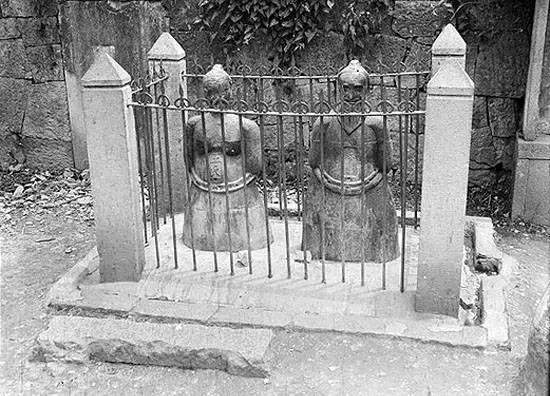 岳飞庙里的秦桧和张俊,姿势和今天的不同。西德尼·甘博摄于1917-1919年间。