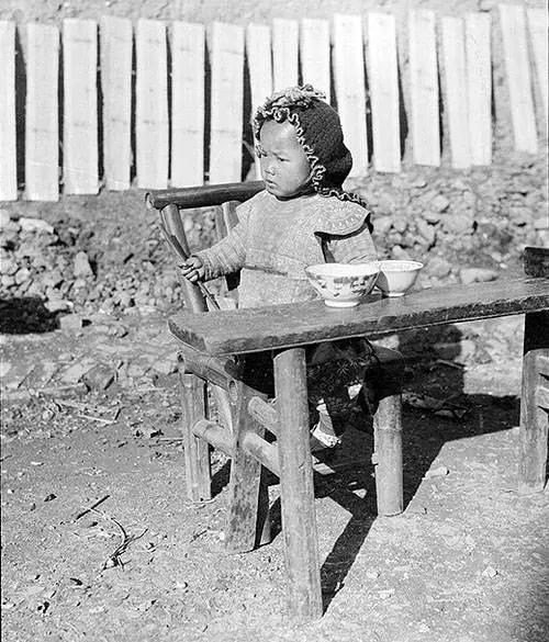 院子里一个独自吃饭的小女孩。西德尼·甘博摄于1917-1919年间。