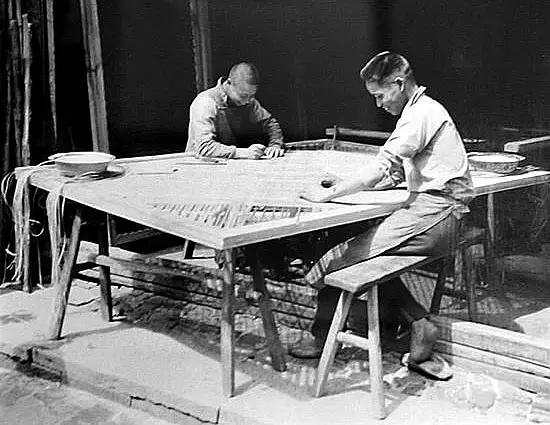 两位工匠正在制作棕床。西德尼·甘博摄于1917-1919年间。
