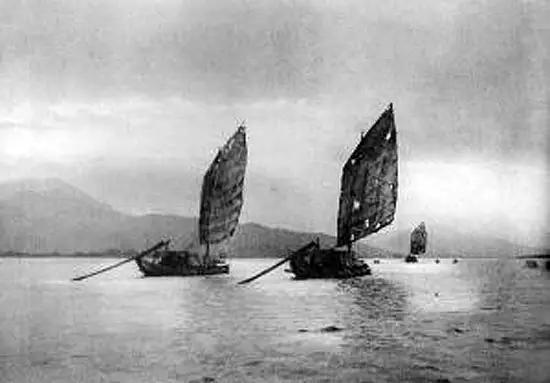 钱塘江上的运货帆船,比一般的货船要宽厚,摇橹也更为粗大,人站在船板上很难驾驭,所以需要站在木架子上。费佩德摄于1910年。