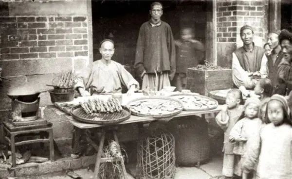 晚清街头的点心铺,店主正在案板上制作点心,边上冒着热气的油锅等着做好的面点入锅煎炸,在前面放置的三个竹制的簸箕里面放置着炸好的点心。