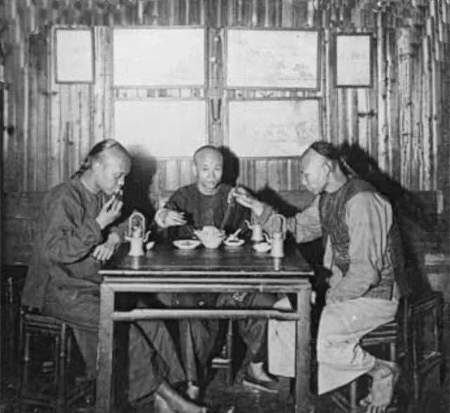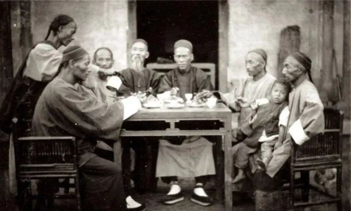 一处百姓就餐照片,看图中人的装扮应该在当时还算比较富裕的阶层,尤其是正前方的那个白胡子老爷爷器宇轩昂的。