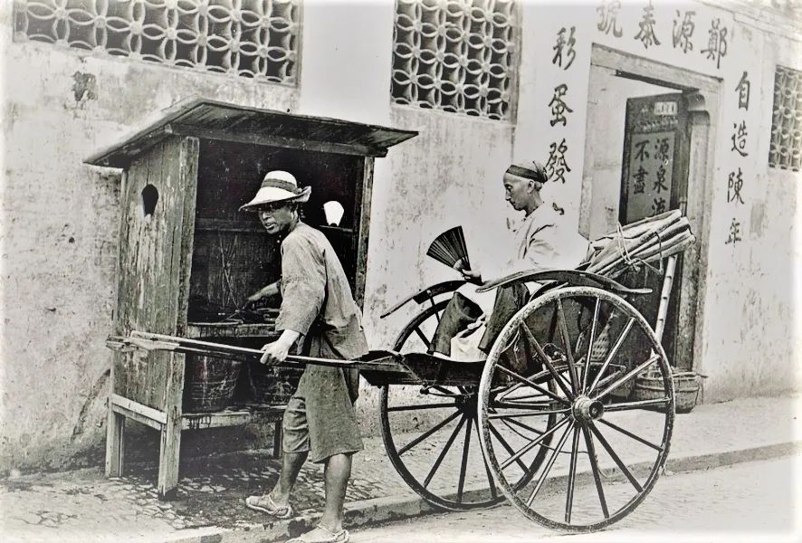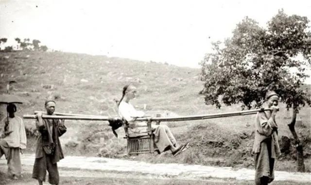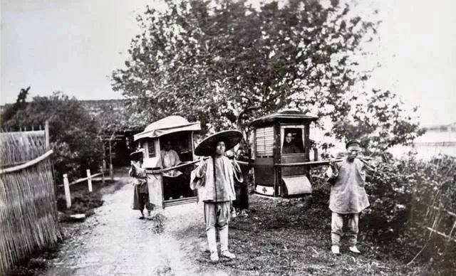 这张是晚清富人出行的画面,分别乘坐两个轿子,轿夫们的服饰朴素。