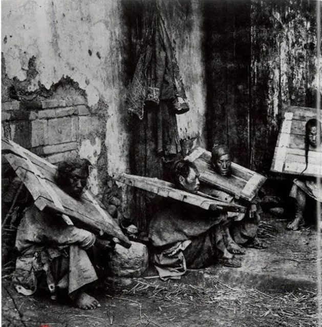 几名囚犯被放置在一个地方集中关押,这些囚犯都戴着重重的木制枷锁,上面还有官府衙门的封条,他们的眼神中透露着无奈与绝望。