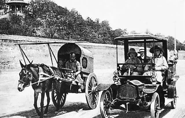 这张是晚清一辆马车与一辆汽车并排而行,路面并不平坦,但是汽车超过马车也是非常轻松的,这画面形成了鲜明的对比,值得珍藏。