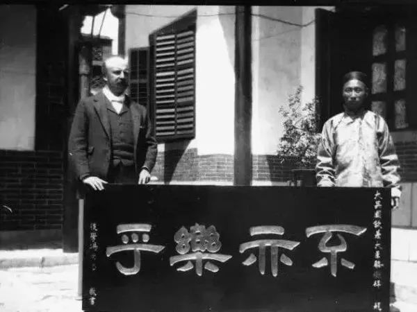 1903年,威海卫租借地行政长官骆任廷拜访曲阜,赠送给了孔子第七十六代传人孔令贻一副牌匾牌的留影,牌匾上写着“不亦乐乎”,画面极具经典。