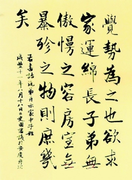 昔年曾与阁下道及逆亿命数,是一薄德。大约读书人犯此弊者最多,聪明而运蹇着,厥弊尤深,富贵得志之人,亦未尝不扰扰焉,沉溺于逆亿命数之中。惟熟读《聪训斋语》,可去此弊。凡病在根本者,贵于内外交养。养内之道,第一将此心放在太平地方,久久自有功效。近将张公书告舍沅弟及儿侄辈,兹并以奉勖。
