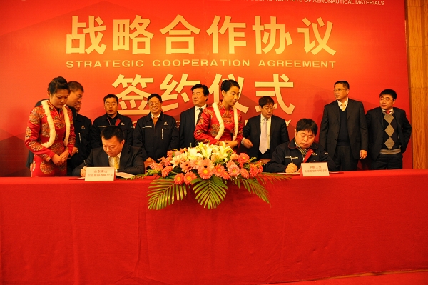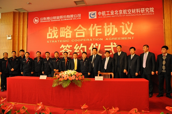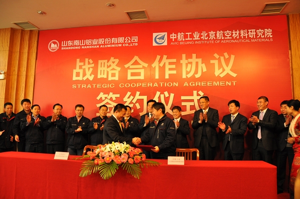 11月13日,山东南山铝业股份有限公司和中航工业北京航空材料研究院在国际会议中心签署了战略合作协议,双方就加强在航空材料研制和应用领域全方位合作达成了共识。中航工业北京航空材料研究院院长戴圣龙,航空材料专家、大飞机专家组组长曹春晓院士,研究院副院长骞西昌,副总工程师丁鹤雁,科技部部长付洋,财务部长熊文峰,物资供应部部长王立成,铝合金专家陆政,铝合金研究室书记黄敏,铝合金研究室主任王胜强,铝合金研究室生产部长张显峰;龙口市副市长孙培键,山东南山铝业股份有限公司董事长宋建波,南山集团总裁程仁策,南山集团总经理邢济君,南山集团技术中心常务副主任刘海石,南山铝业股份有限公司铝材公司总经理杨增光,南山铝业股份有限公司轻合金公司总经理宋昌明、副总经理吕正风等出席了签约仪式。