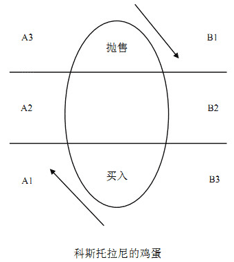 科斯托拉尼曾经把自己的投资思想简化成了一个模型,称之为“科斯托拉尼的鸡蛋”。他认为市场总是处在两个趋势之间,其一是超买的趋势,其二是超卖的趋势,前者就是牛市,后者就是熊市。他将这两个趋势总结成三个阶段,分别是:校正阶段、适应阶段和过渡阶段。