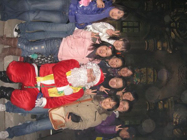 先省略千百字形容24号白天和晚上的辛苦。当我穿上圣诞老人服装的那一时刻起,我的新使命就来了~要把快乐和礼物带给大家!装得满满一袋子的糖果我在服务人员的护送下走进了教堂,心中三~二~一倒数。“圣诞快乐!~~~~”我张开双臂大喊道,声音在教堂的穹顶回响,太震撼了~我仿佛就真的变成了Santa!所有人的目光齐刷刷的看着我(的糖口袋)!一把把撒出去的糖果巧克力,让大家欢欣雀跃!热场完毕,我连糖纸都没留下~被抢劫一空。非常感激一直陪我挨冻的你!雨听见有人说“圣诞老人的老婆真漂亮!”这句话不知道是我听了该高兴呢~还是她听了该高兴。