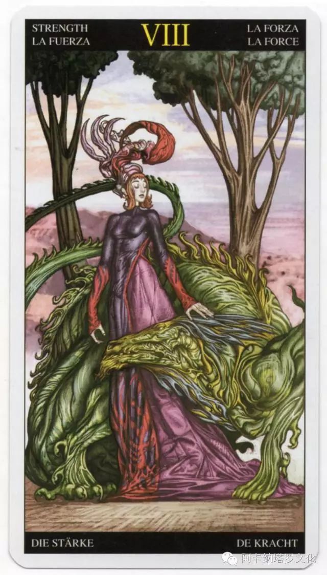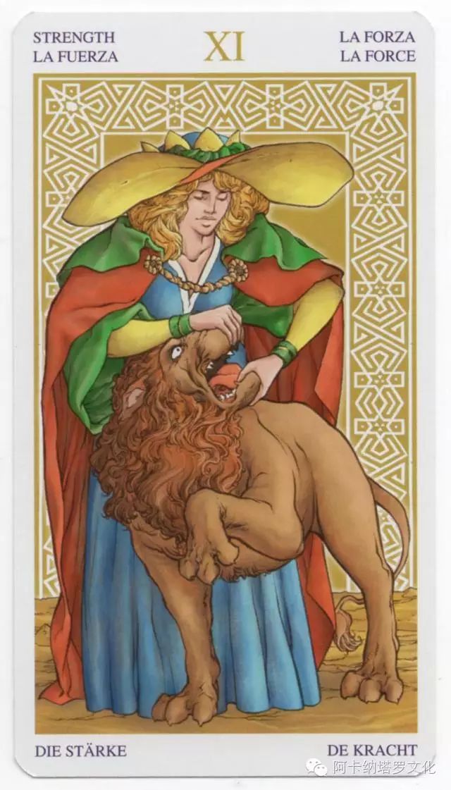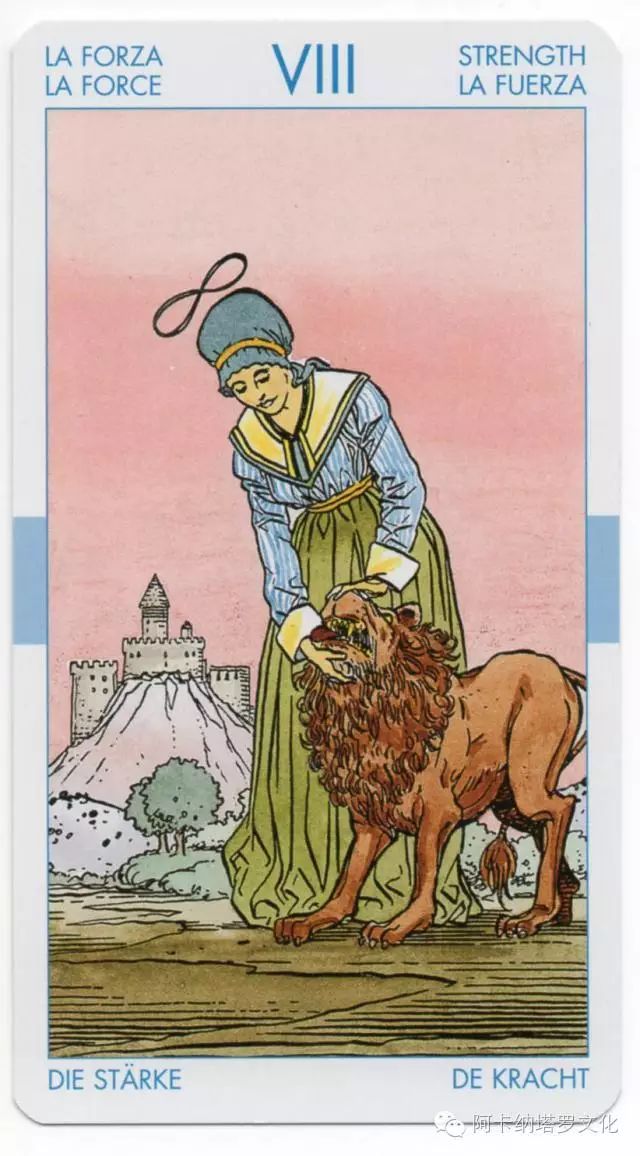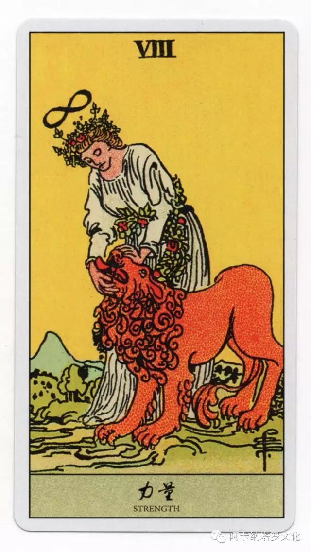 在我第一次听到“力量”这一张牌的名字的时候,还没看过伟特塔罗牌牌面的时候,我脑海里想象的画面是一位孔武有力的男士,与某种动物在搏斗,展现出他的强大的力量,力气。然而,当我看到牌面,就发现与我想象的不同,牌面画的是一位女士与一只狮子,女士在抚摸它,她们非常亲密,让我很震撼。