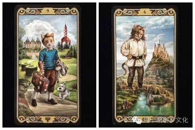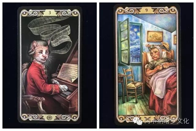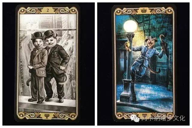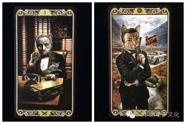 不过这里的喵咪可不是一群可爱的hello kitty,他们的相貌和行为更贴合人类,眼镜、胡须和毛发的修饰下,喵咪们的神情更加拟人逼真,加上特定的场景和背景装饰,每一张牌都是杰作,叙述着每个主角的故事。