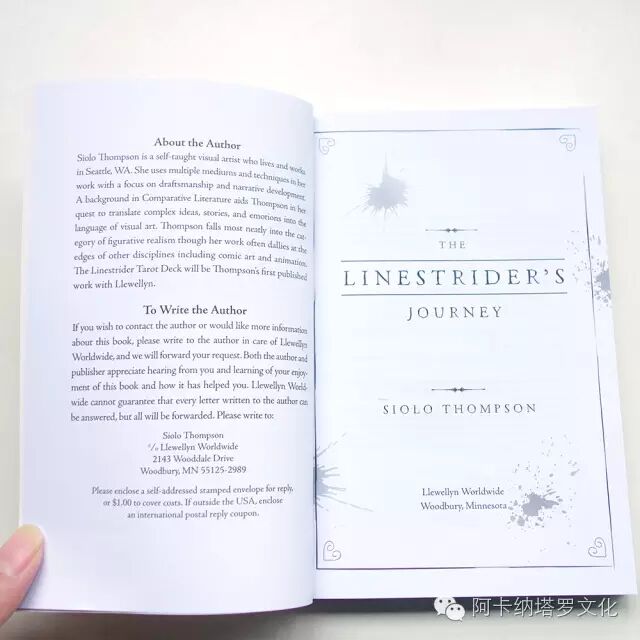 274页英文书由创作者本人撰写,详细介绍了每张牌的含义,包括创作灵感的细节描述及自传描述。书还有给解读者们的一些建议,比如如何解读和保存牌,如何操作等等,还有一些关于牌意的有趣信息,比如大牌的解读技巧,比如高塔牌意产生的影响,还有作者的个人信仰等,其中有个小章讲解了关于三张牌的牌阵,五张牌的牌阵,占星术牌阵,生命数字,植物的对应关系等等。每张牌除了正逆位含义,还有对图解和象征符号的延伸意思。