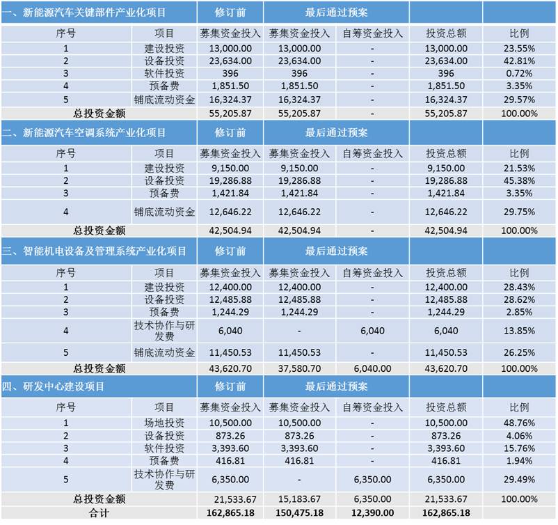 修改要点:将技术协作与研发费(主要为研发人员工资、技术合作费等)改为自筹资金投入;保留预备费、铺底流动资金及补充流动资金。