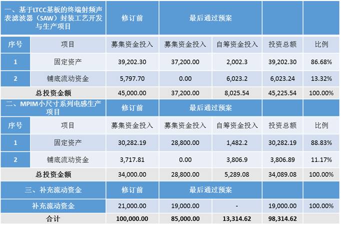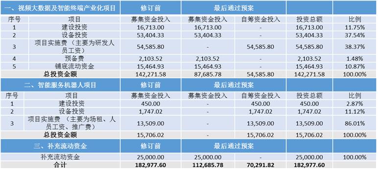 修改要点:将项目实施费(主要为研发人员工资、场地租赁费、市场推广费等)改为自筹资金投入;保留预备费、铺底流动资金及补充流动资金。