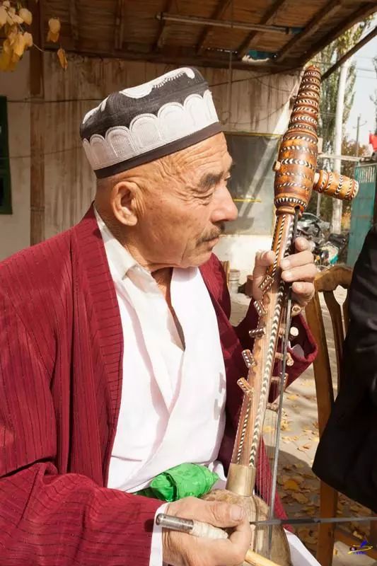 “刀郎木卡姆”的主要伴奏乐器为拉弦乐器刀郎艾捷克、拨弦乐器卡龙、刀郎热瓦甫,以多面达普击节相伴,上述拉弦、拨弦乐器在伴奏中,经常不作跟腔,而奏出各种各样的枝生复调或节奏型,从而与声乐形成复杂的多声部效果。可惜我没有拍全。