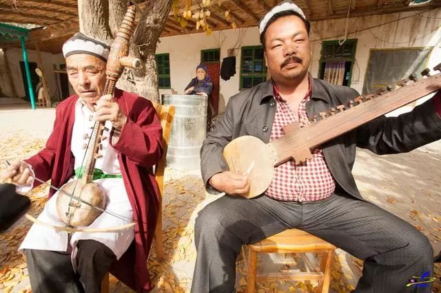 国家级非物质文化遗产传承人艾山·丫丫和儿子一起为我们弹奏刀郎木卡姆。