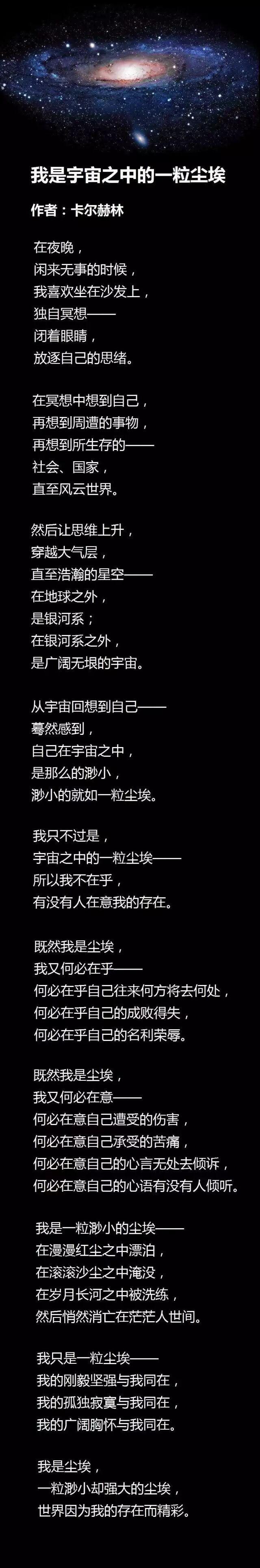 1、本文是我在一次晚间冥想之后写的。在闭目冥想的过程中,我真的感觉自己仿佛飘了起来,置身于茫茫的宇宙空间里,在我身边就是浩淼的星空。当冥想快要结束的时候,我突然感觉自己的身体一沉,整个人从天上往下坠。冥想结束之后,顿觉自己,在宇宙空间之中实在是太渺小了。