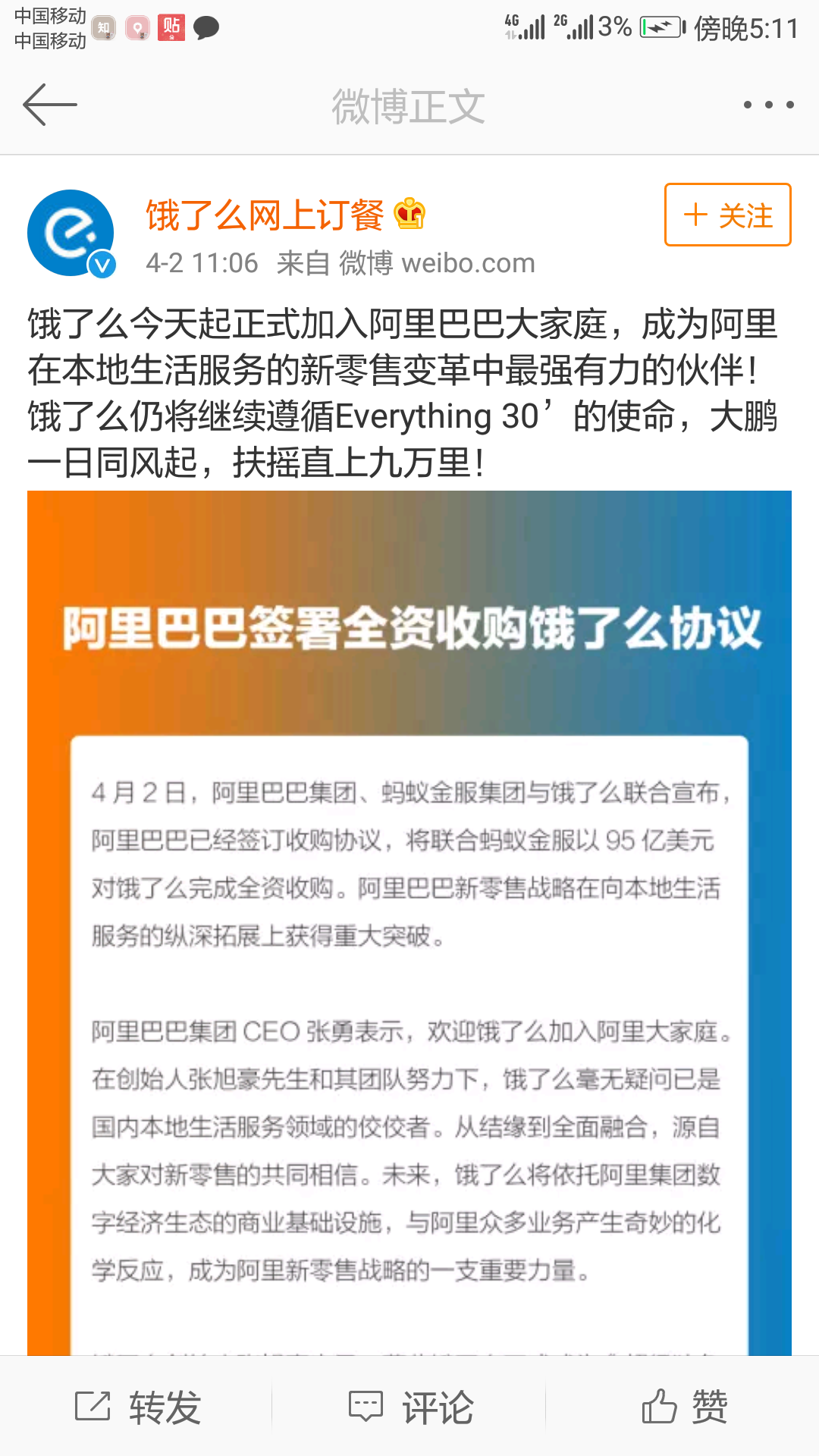 今天,愚人节后第二天,“饭圈”就发生了一件惊天动地的大事:阿里巴巴全资收购饿了么。而这也是到目前为止,中国互联网最大的全现金收购!