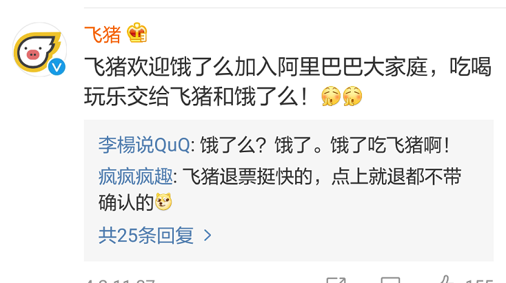 这不,飞猪第一时间就在官微上欢迎饿了么的到来,还喊话剁手党,吃喝玩乐就靠飞猪和饿了么哥俩了。