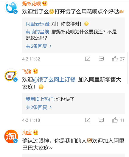 在阿里巴巴的官微下面,蚂蚁花呗、淘宝、大麦网也都队列整齐的表示欢迎,大家或是调侃、或是表白,俨然就是一个热闹的大家庭。