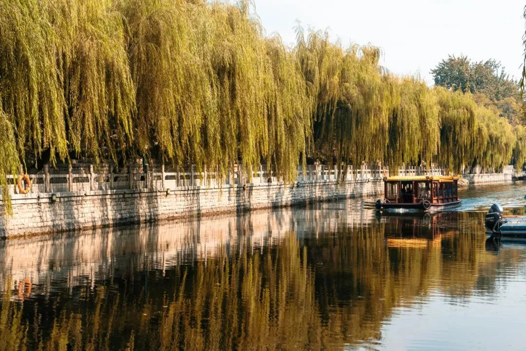经过曲折通幽的亭台回廊,放眼望去,垂柳的枝条不时撩拨水面,成排的树木环绕湖畔,不禁感叹,难怪夏雨荷会在此落脚。