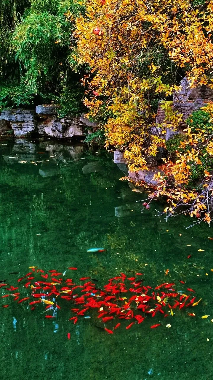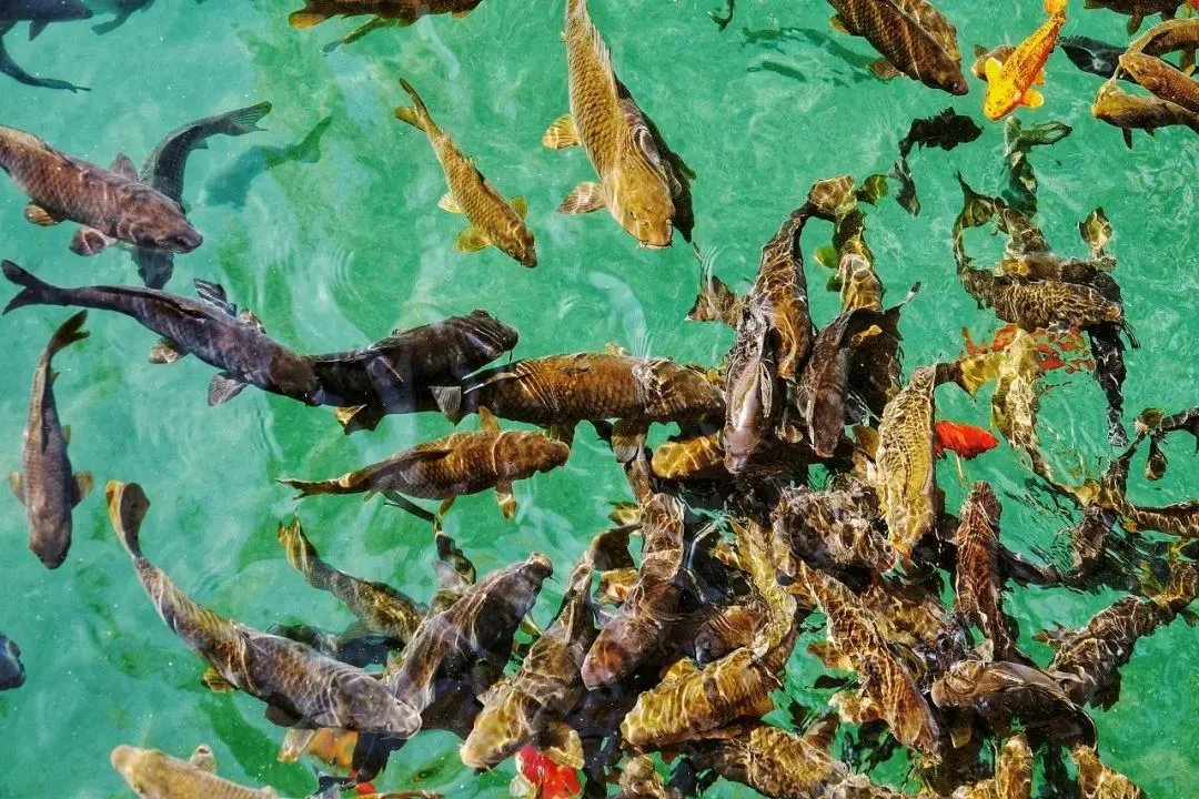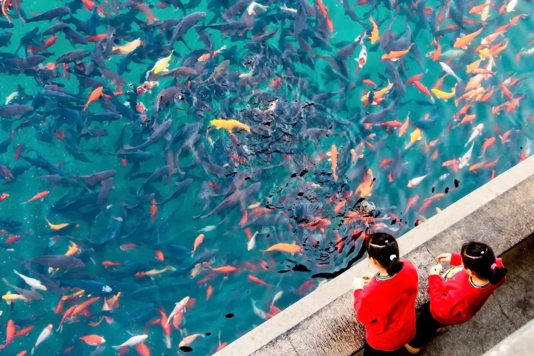 湖边围着不少大人和孩童,引得一无所知的人也上前围观,原来湖中有不少锦鲤,成群的气势不止震撼那么简单。