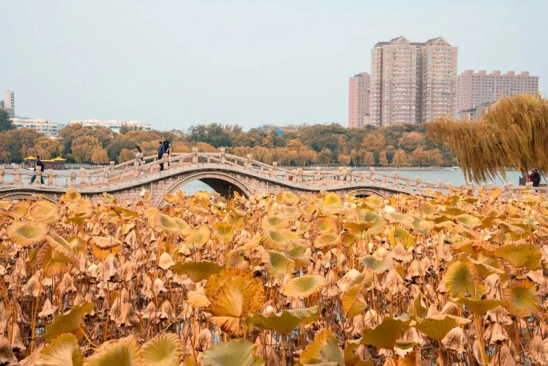 秋季,湖里的荷花已经过了季节,泛黄的宽大叶子在风中摇曳,却也成一景。