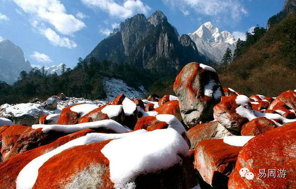 除了冰川,在海螺沟景区旁边的燕子沟和雅家梗还分布着大片的红石滩,蓝天、白雪、红石,强烈的色差会让你的相机里增加不少好片子。