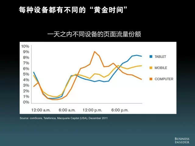 每种设备都有不同的“黄金时间”,图为一天之内不同设备的页面流量份额