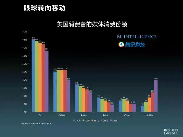 眼球转向移动,图表为美国消费者的媒体消费份额