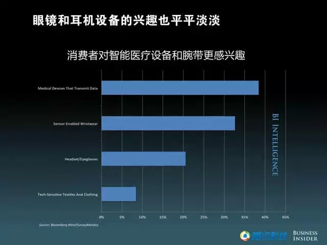 眼镜和耳机设备的兴趣也平平淡淡,消费者对智能医疗设备和腕带更感兴趣。