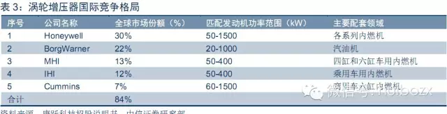国际市场:涡轮增压器在国际市场的集中度较高,前五名生产商的市场份额达到84%。目前,国际上从事涡轮增压器生产的生产商包括:Honeywell(霍尼韦尔)、BorgWarner(博格华纳)、MHI(三菱重工)、IHI(石川岛播磨重工业株式会社)、Cummins(康明斯)等。2012年,全球主机配套增压器需求约在3,300万台,美国Honeywell公司的增压器总出货量占全球市场份额的30%,居行业首位;排名前五位生产商的增压器出货量占据了全球市场份额的84%。
