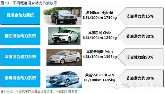 混合动力有望实现15%-50%的节油潜力。混合动力可划分为轻混合动力系统、辅助混合动力系统(中混)、深度混合动力系统,分别有望实现15%、30%、50%的节油潜力。如果采用插电式混合动力,则有望实现80%以上的节油潜力。