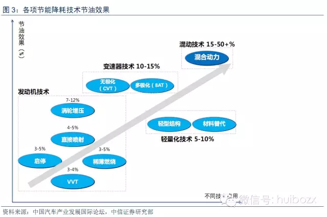 1)高性能发动机,例如涡轮增压汽油机有望实现7%-12%的燃料消耗;