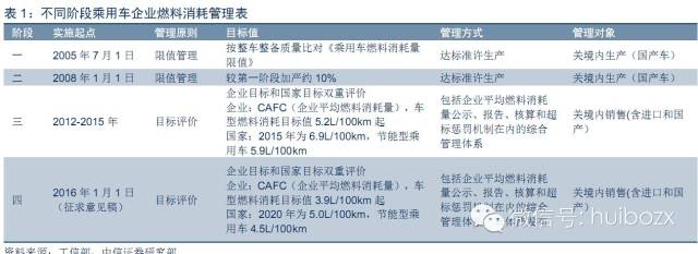(四)机遇:与其打政策“口水仗”,不如打技术“攻坚战”。与整车企业的窘境相比,优势零部件企业则“各显身手”。我们认为,中国油耗标准提升,将驱动整车和零部件公司在如下领域的研究拓展和投资机会:1)高性能发动机技术(涡轮增压、缸内直喷、电控燃油喷射等),2)车身和发动机轻量化技术(镁铝合金、高强度塑料、碳纤维等),3)启停电机(电池、电机),4)混合动力汽车(自动变速箱、电池、整车匹配等),5)新能源汽车(纯电动汽车、插电式混合动力及其零部件等)。
