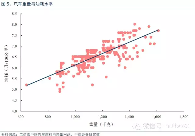 汽车轻量化对燃油效率提升的贡献明显。据工信部的油耗公告,按照不同车辆综合工况的油耗水平拟合结果为:汽车重量每降低100千克,可节约百公里油耗约0.28升。在实际使用中,相关研究显示:若汽车整车重量降低10%,燃油效率可提高6%-8%,减少二氧化碳排放约50克/公里;汽车整备质量每减少100千克,百公里油耗可降低0.3-0.6升。