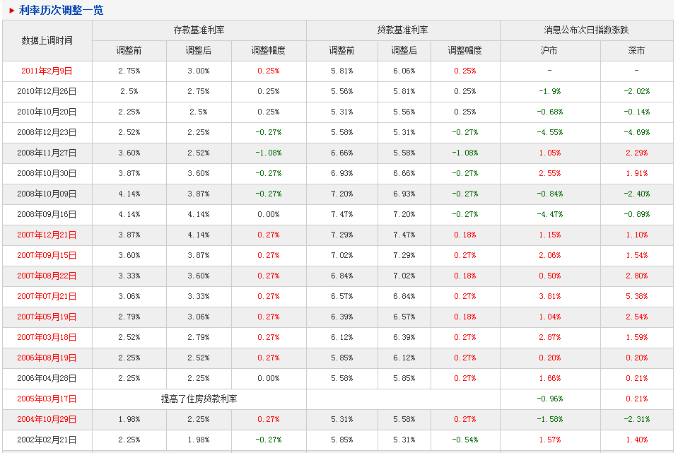 比如,同样是加息,在一些时候会导致市场的暴跌,而在另外一些时候,它导致的结果却是上涨[见下图:2002年2月—2011年2月的利率调整及次日的股市走势]。