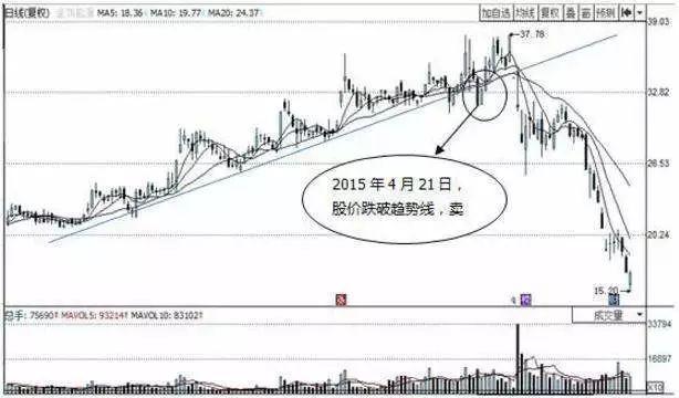 https://p1-tt.byteimg.com/origin/pgc-image/RPKQlXvCR2Ag77?from=pc如图所示,金鸿能源的股价在2015年初开始了一波上涨走势,投资者把该股上涨过程中的低点用直线连接就构成了一条趋势线,股价也一直沿趋势线攀升。2015年4月21日,股价继续前一交易日的下跌,并跌破了趋势线,这时,投资者就可以考虑卖出该股止损了。该股后期的走势出现了大幅下跌,投资者如果此时卖出该股,就能回避这次下跌造成的损失。
