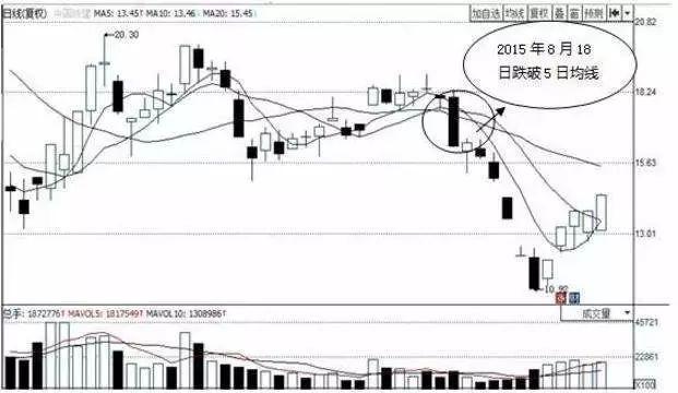 https://p6-tt.byteimg.com/origin/pgc-image/RPKQlMOGyrBmVl?from=pc投资者如果把5日均线作为止损位,那么,一旦该股的股价跌破5日均线,投资者就必须卖出该股。如图4-5所示,中国铁建经历了一轮上涨之后,2015年6月中旬开始,随着大盘一路下跌。股价在下跌过程中,曾出现了一波反弹行情,投资者若出于抢反弹的动机买入该股后,可以将5日均线设置为止损位,一旦股价跌破该均线立即止损。2015年8月18日,该股股价大幅下跌,并一举跌破了5日均线,此时,该选择卖出该股止损。